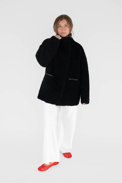 The suki jacket is crafted from 100% wool outer, with the interior of the fabric a suede polyester.